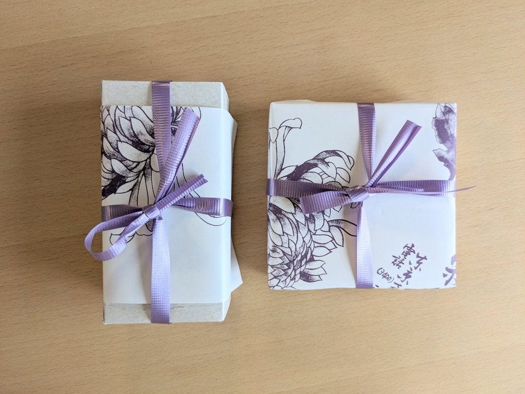 菊屋の包みは菊の花柄。生菓子以外にも購入したのでそれは次項にて。