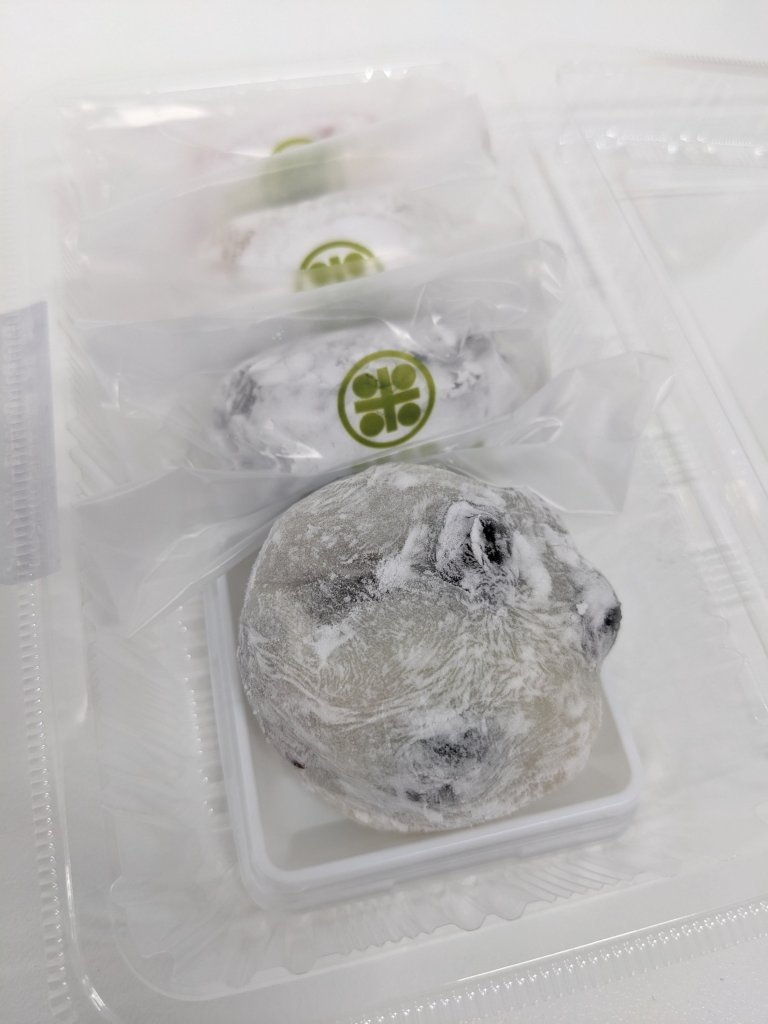 黒豆大福は粒感控えめの粒あん。ほどよい柔らかさの餅生地にやや食感を残した黒豆が存在感大!甘さも程よく美味しかった。