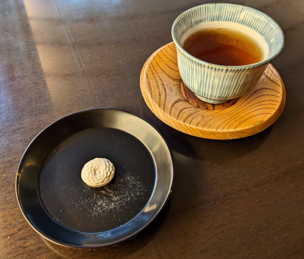 席に着いて間もなく、温かいほうじ茶と落雁が提供された。