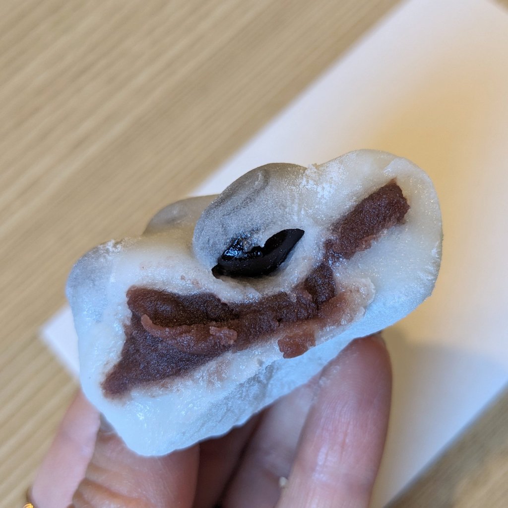 黒豆大福の生地にはねっとりとした大ぶりの黒豆が入っている。