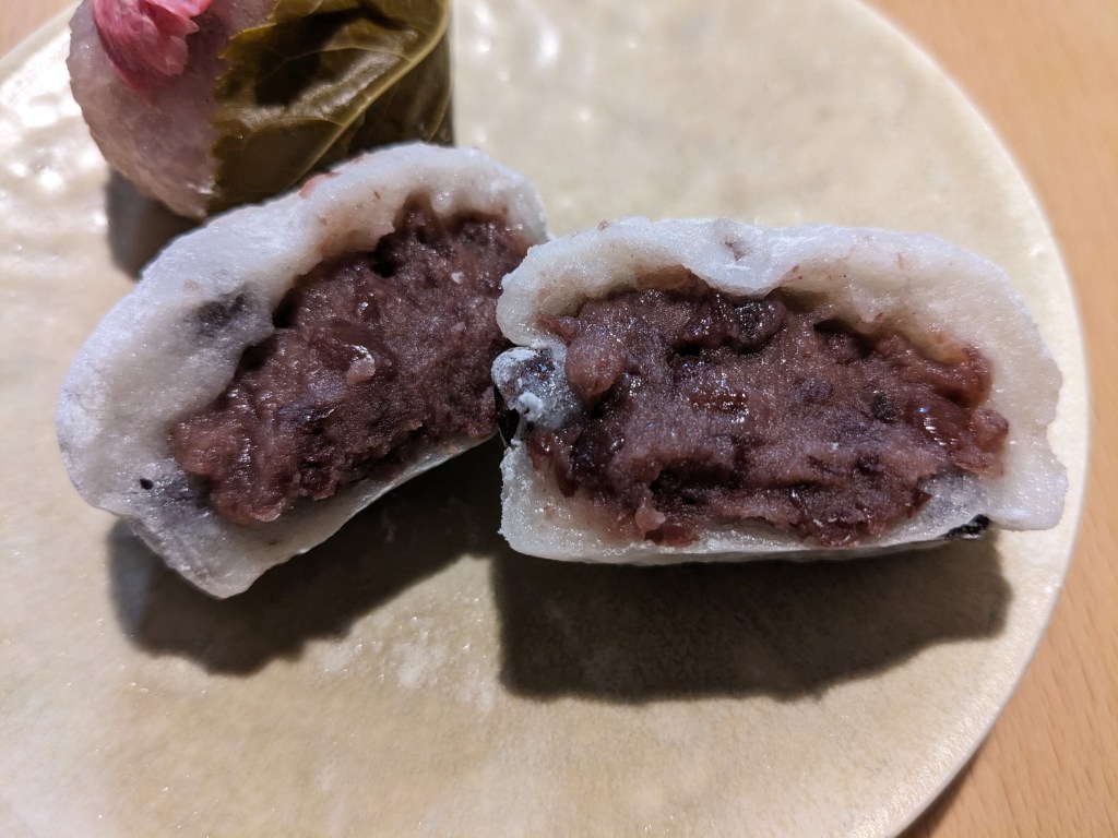 桜餅は“道明寺”と“薄皮で巻かれた関東風”の両方ありました。私は道明寺のつぶつぶ感が好きだから、いつも道明寺を選びがち。中にはこしあんが入っている。一口サイズで食べやすい。