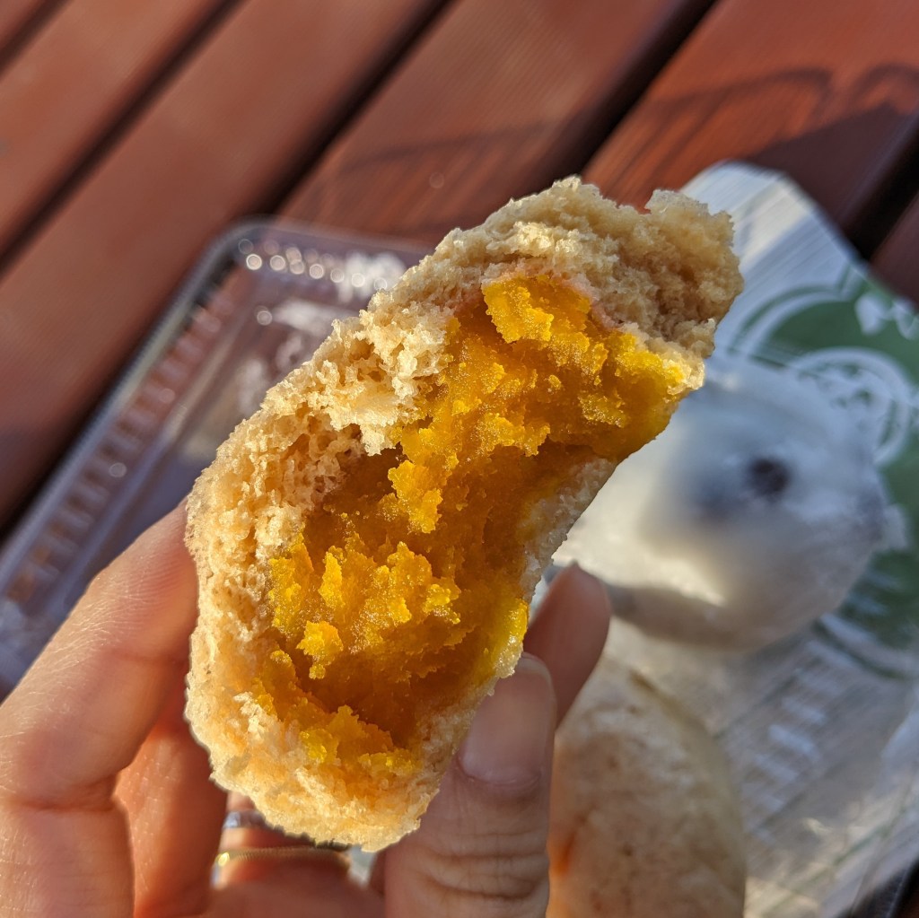 ずっしりとした饅頭の中には中にはカボチャ餡がたっぷり入っている。