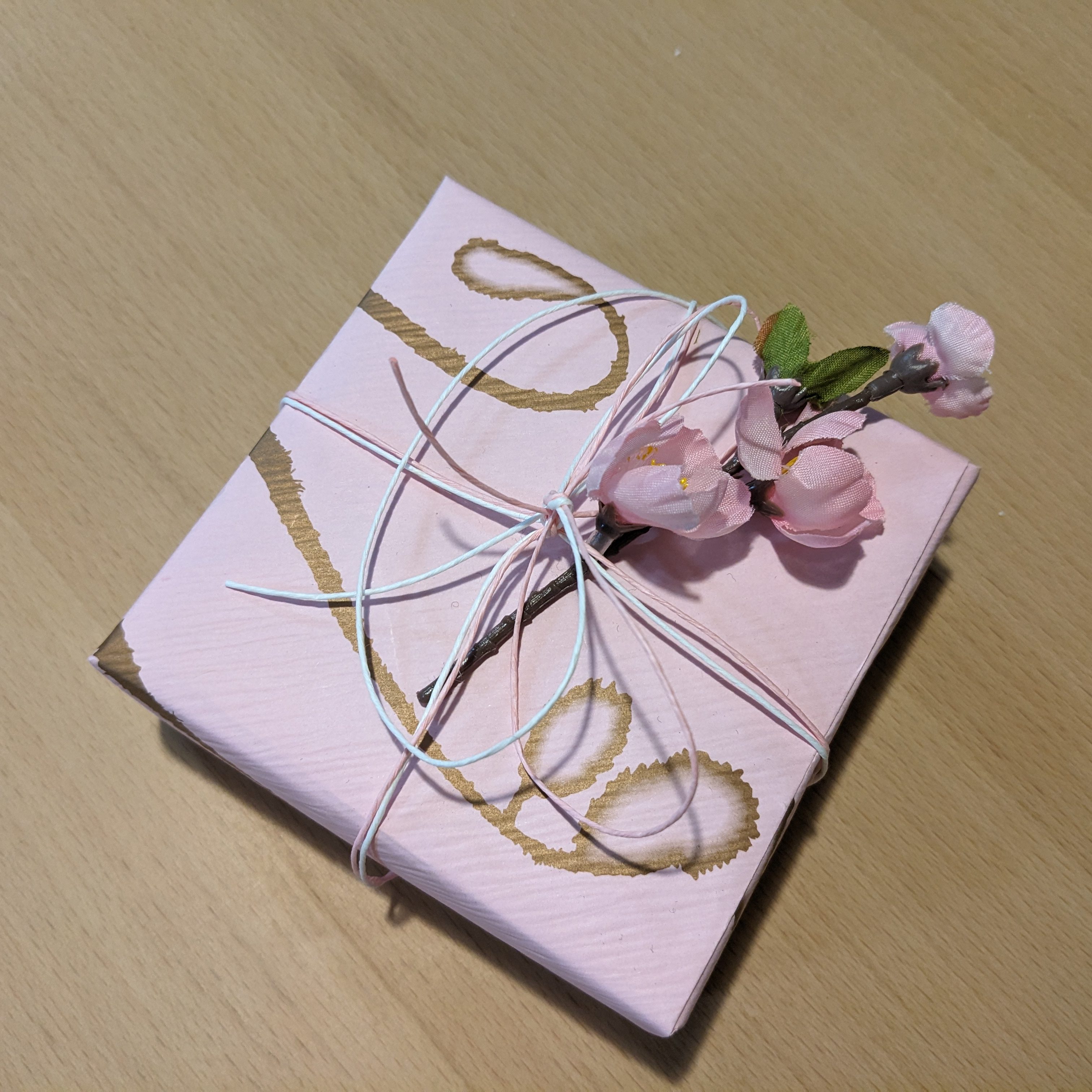 春らしい包みが素敵!お花が添えてあるわあ。