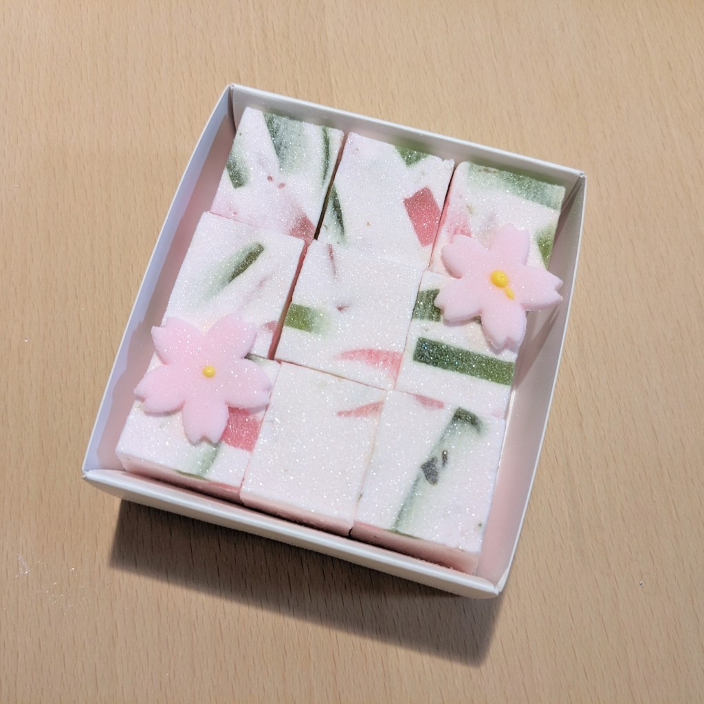 中には綺麗に並んだ桜のお干菓子と淡雪羹。大きさは2~3㎝四方くらいかな。