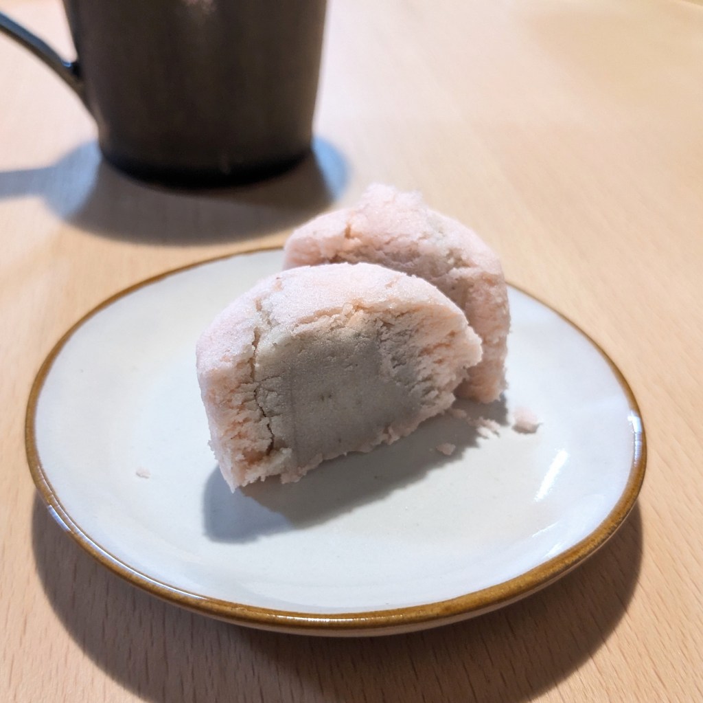 淡いピンク色の外餡には塩漬けにした桜の花が、淡い紫色の中餡には刻んだ桜の葉がが入っているそう。桜の香りの中にほんのり黄身の味がする。