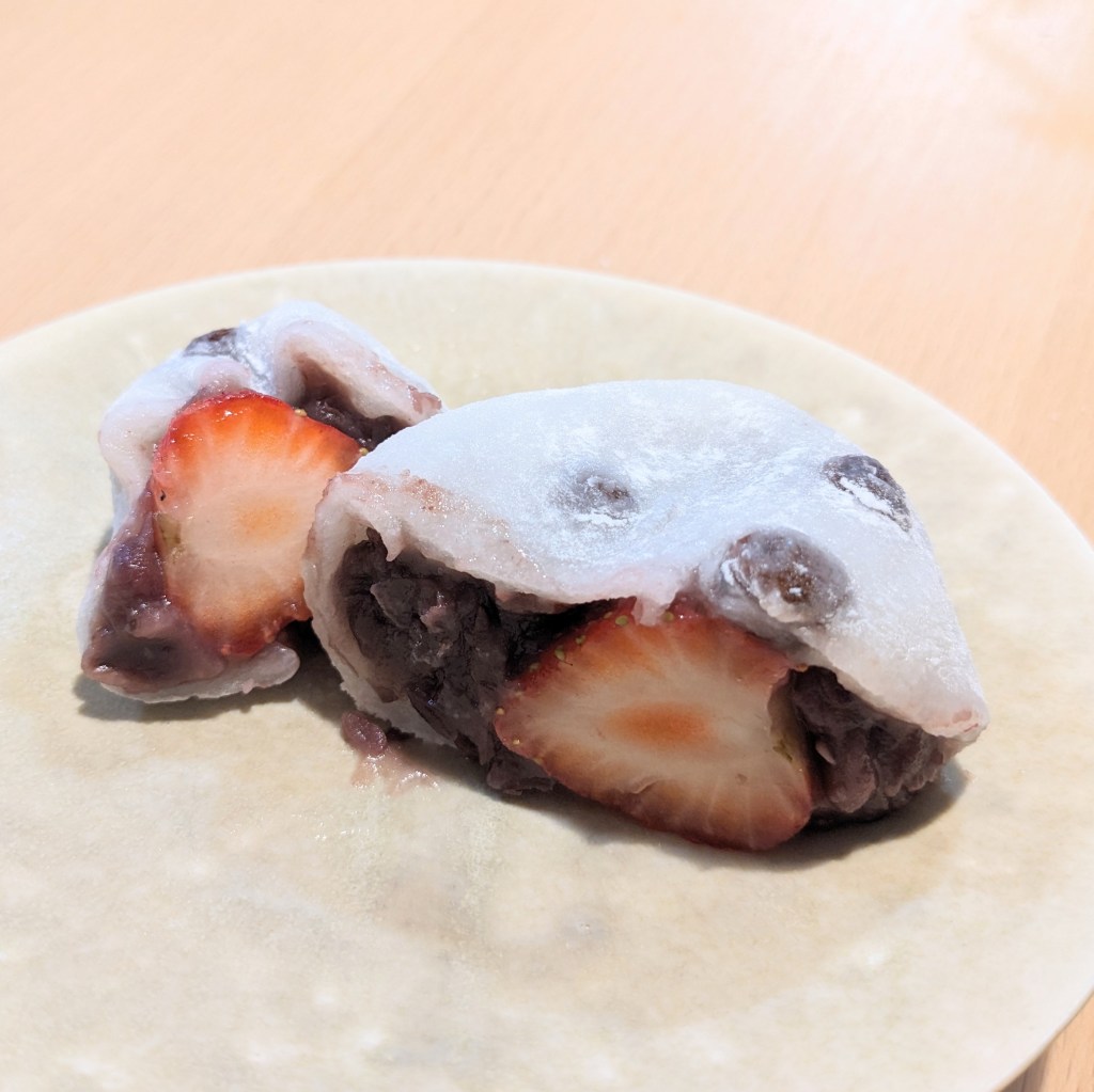さっぱりとした甘さのあんと、いちごほのかな酸味。粒あんは柔らかめで、ジューシーないちごとの相性が良い。豆も入っているけれどそんなに喧嘩してる感はありませんでした。