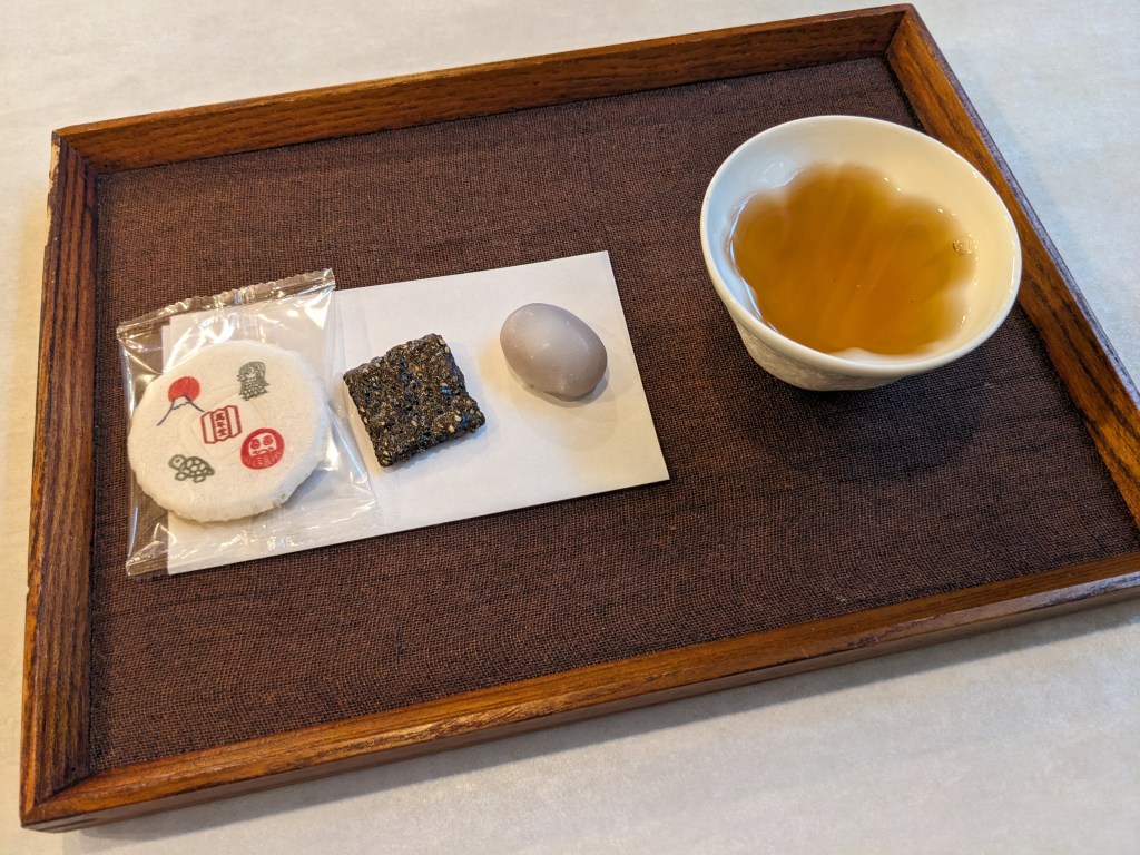 麩焼き、松崎煎餅、石衣、ほうじ茶。