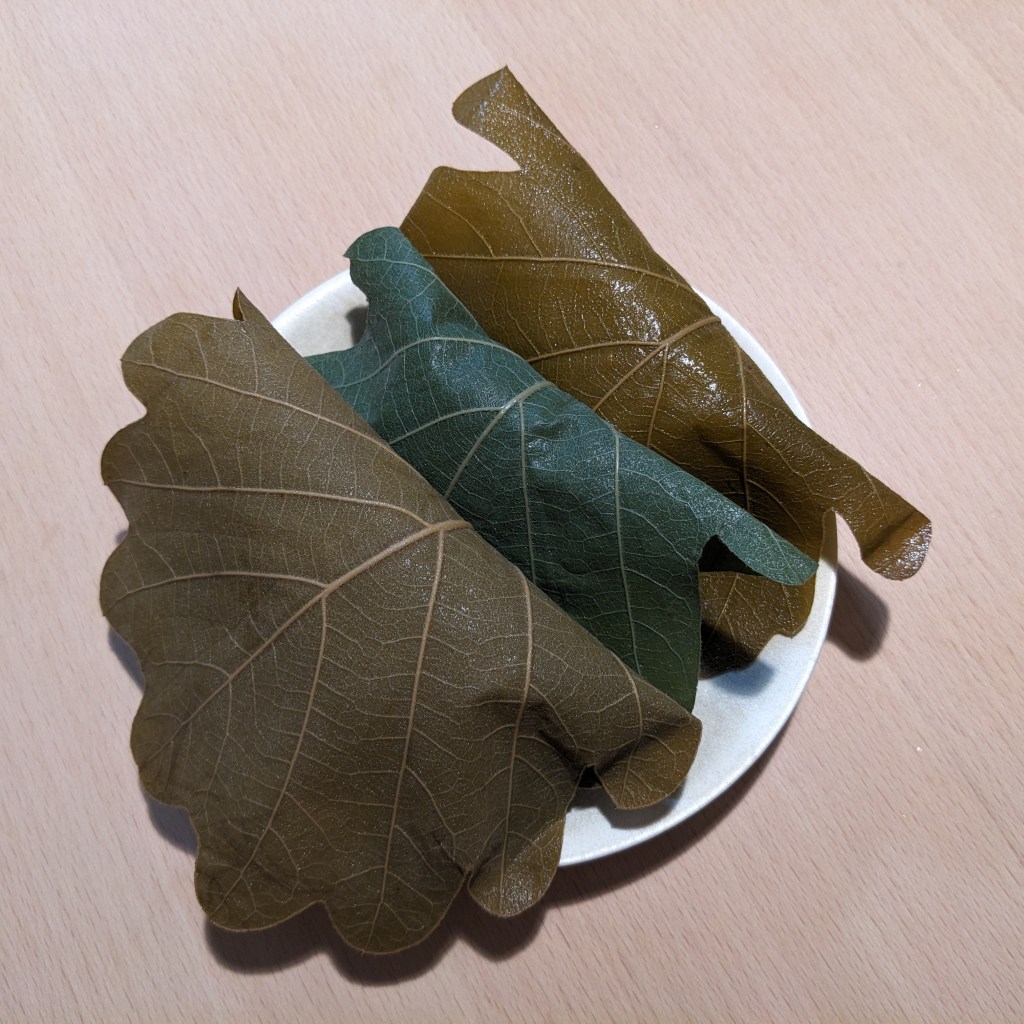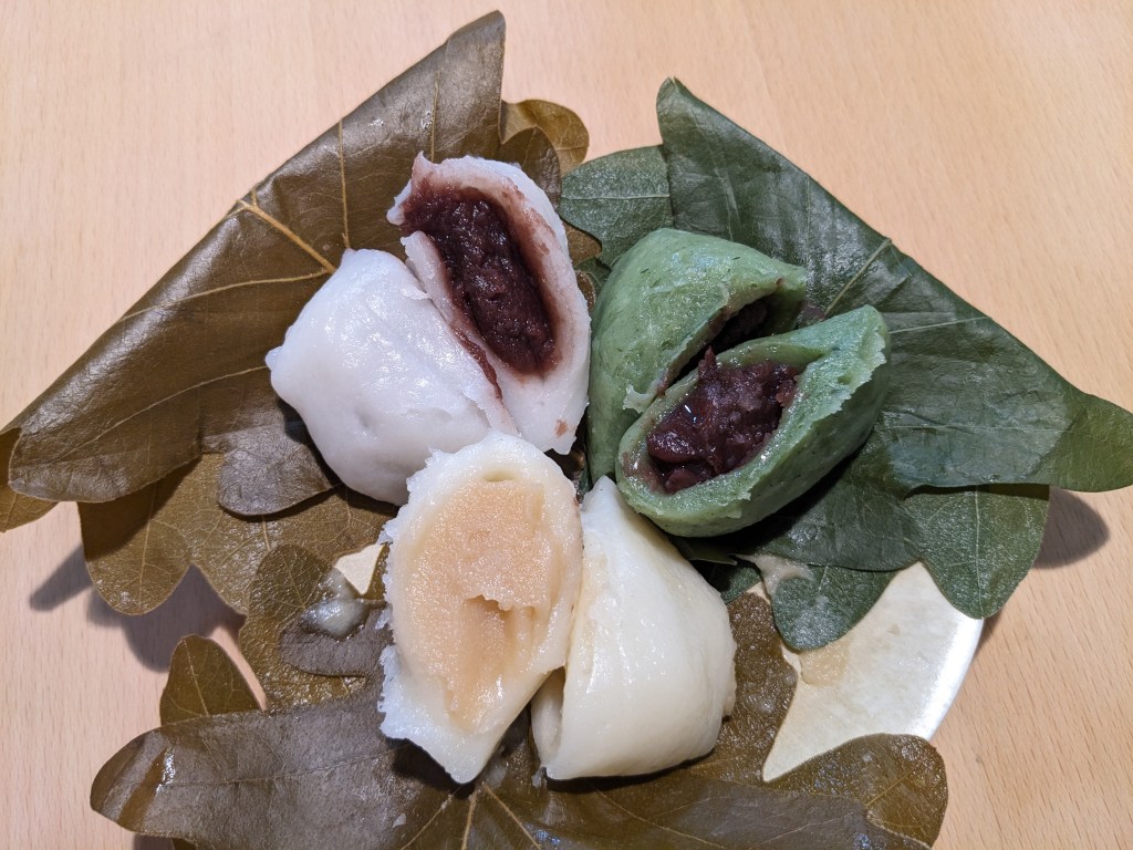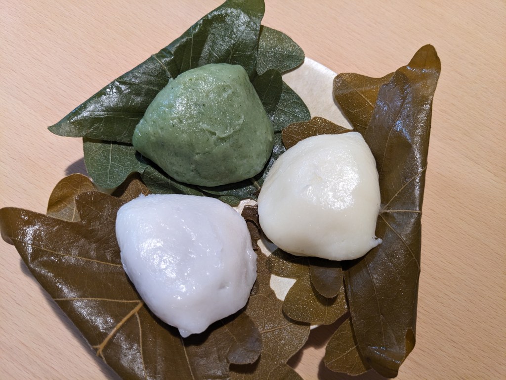 茶色い葉っぱに包まれているのが白い餅のこしあんと、ほんのり黄色い味噌あん。